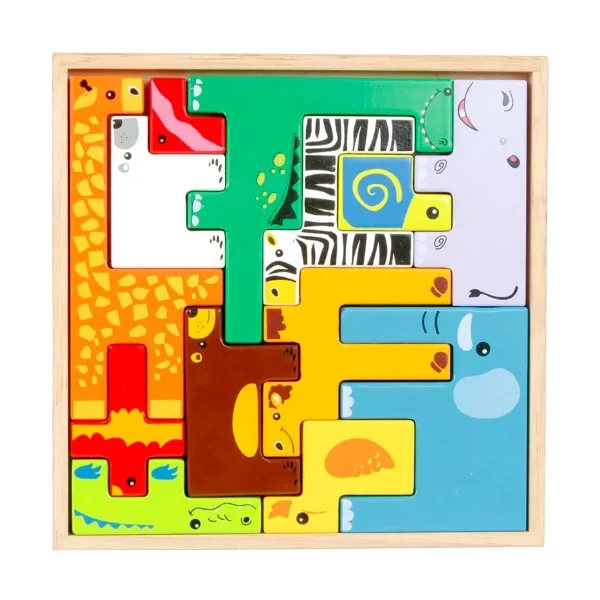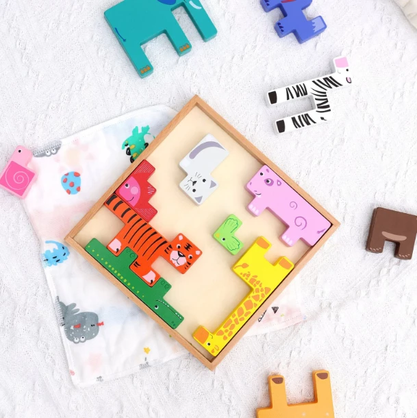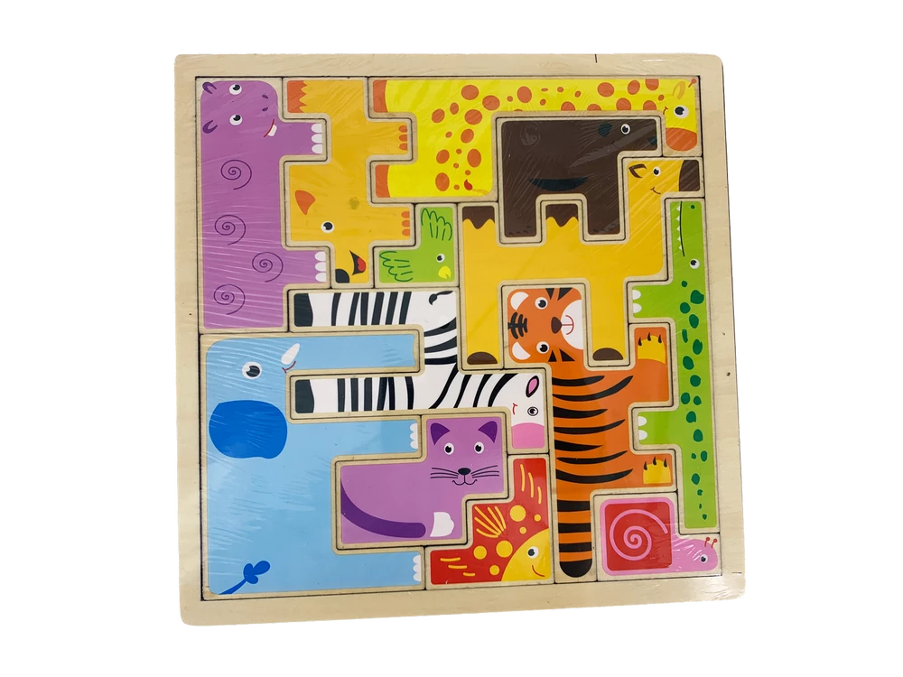 Este puzzle de animales de madera invita a compartir tiempo, imaginar historias y construir pequeños mundos sobre la mesa o el suelo del hogar.
