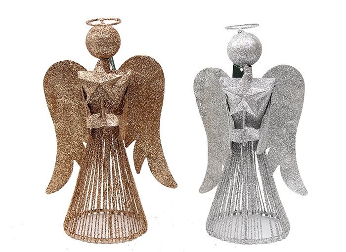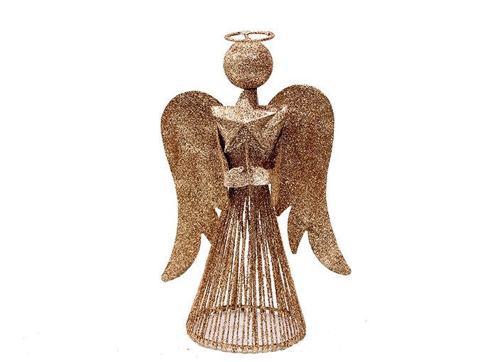 Divino Angel de metal dorado con glitter, con estrella en mano para ser usado como puntal, o adorno de mesa.