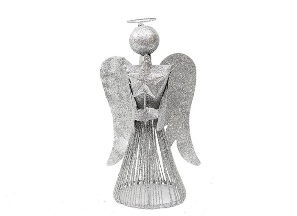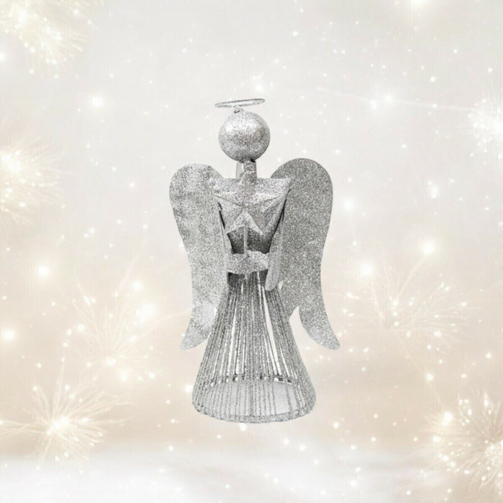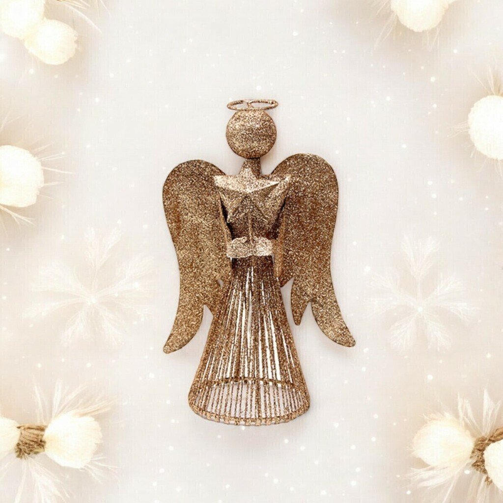 Ángel de metal con brillos y estrella de 25 cm, ideal para tu decoración navideña. Este elegante adorno combina brillo y detalles finos para añadir un toque celestial a tu hogar. Perfecto para mesas, repisas o árboles, crea un ambiente festivo y mágico con este ángel encantador.