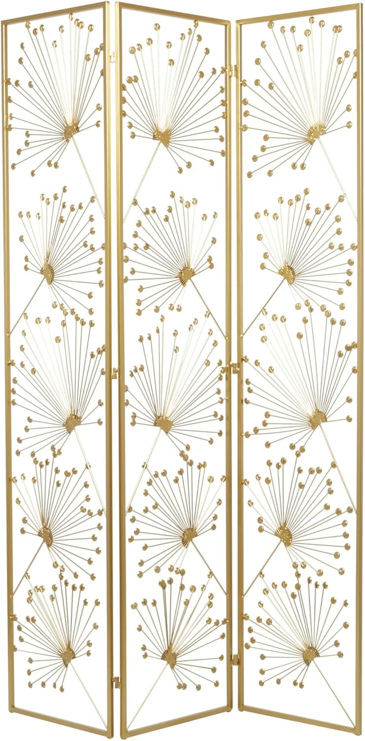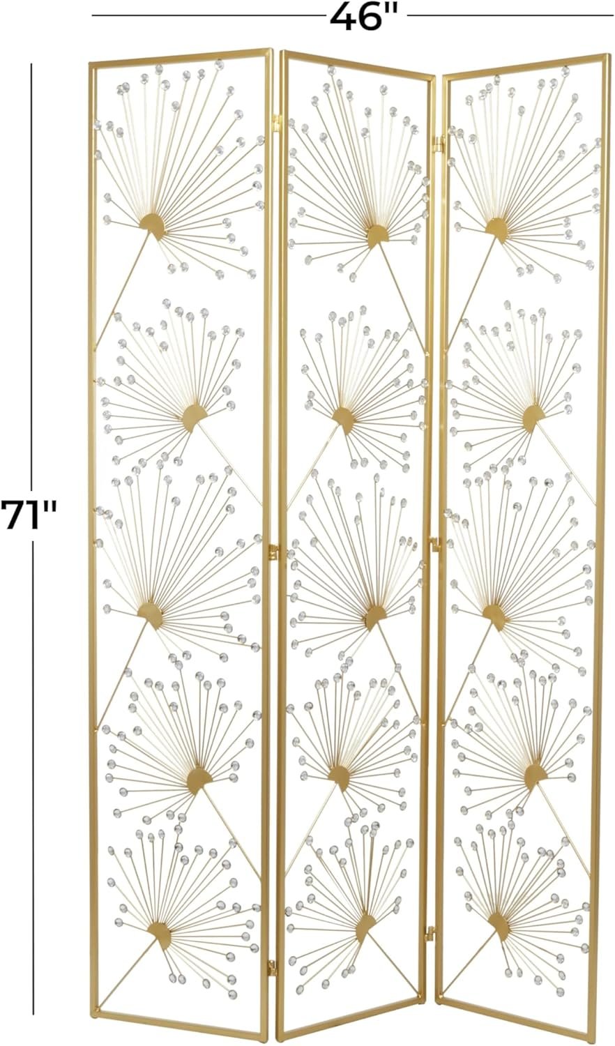 - El biombo divisor de ambientes de metal dorado mide 45,50 pulgadas de largo x 1 de ancho x 71,13 de alto y pesa 18 libras.