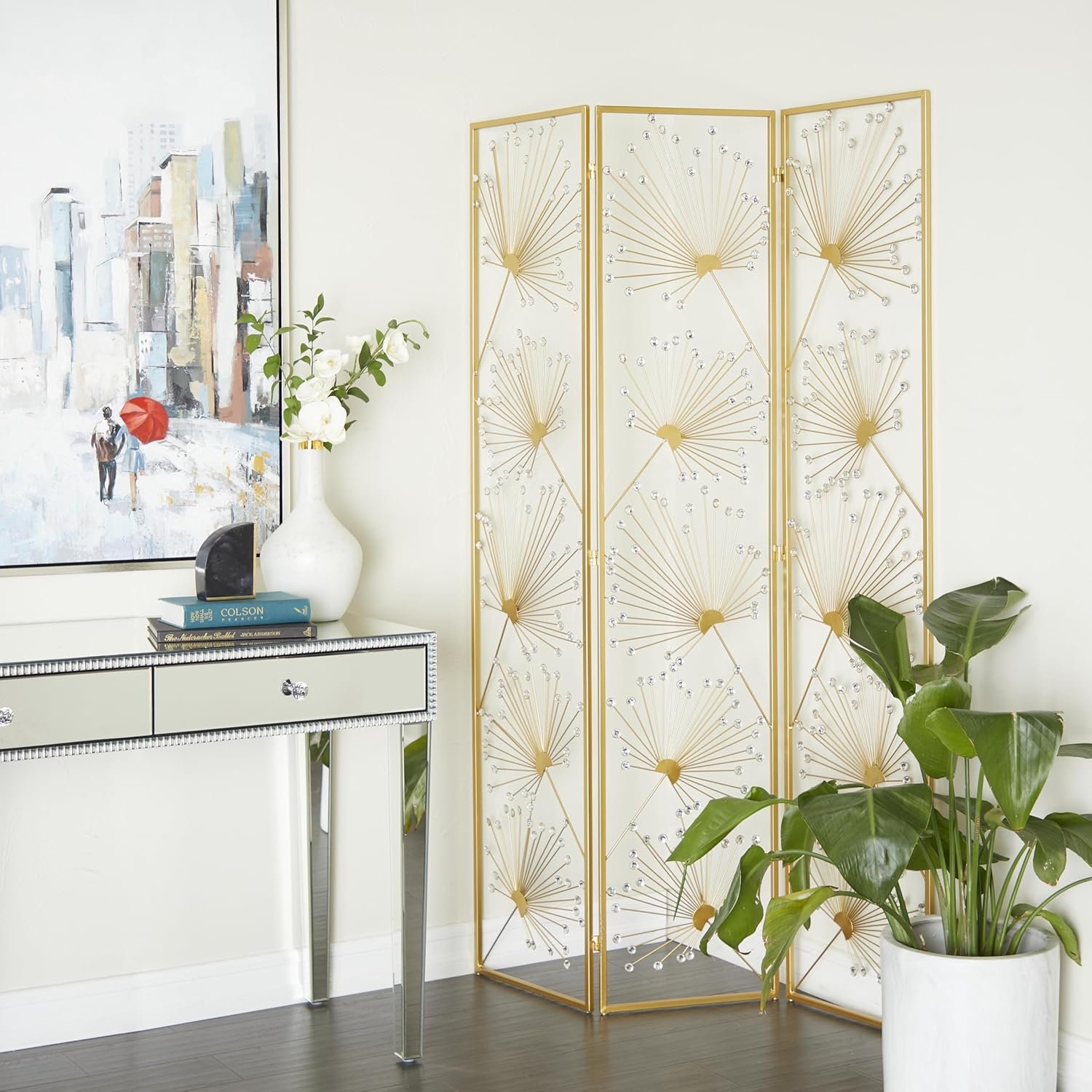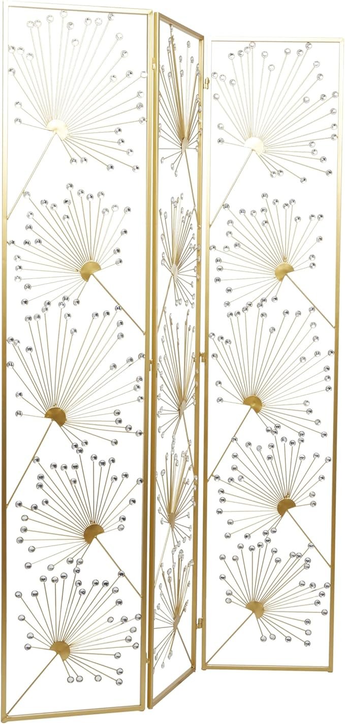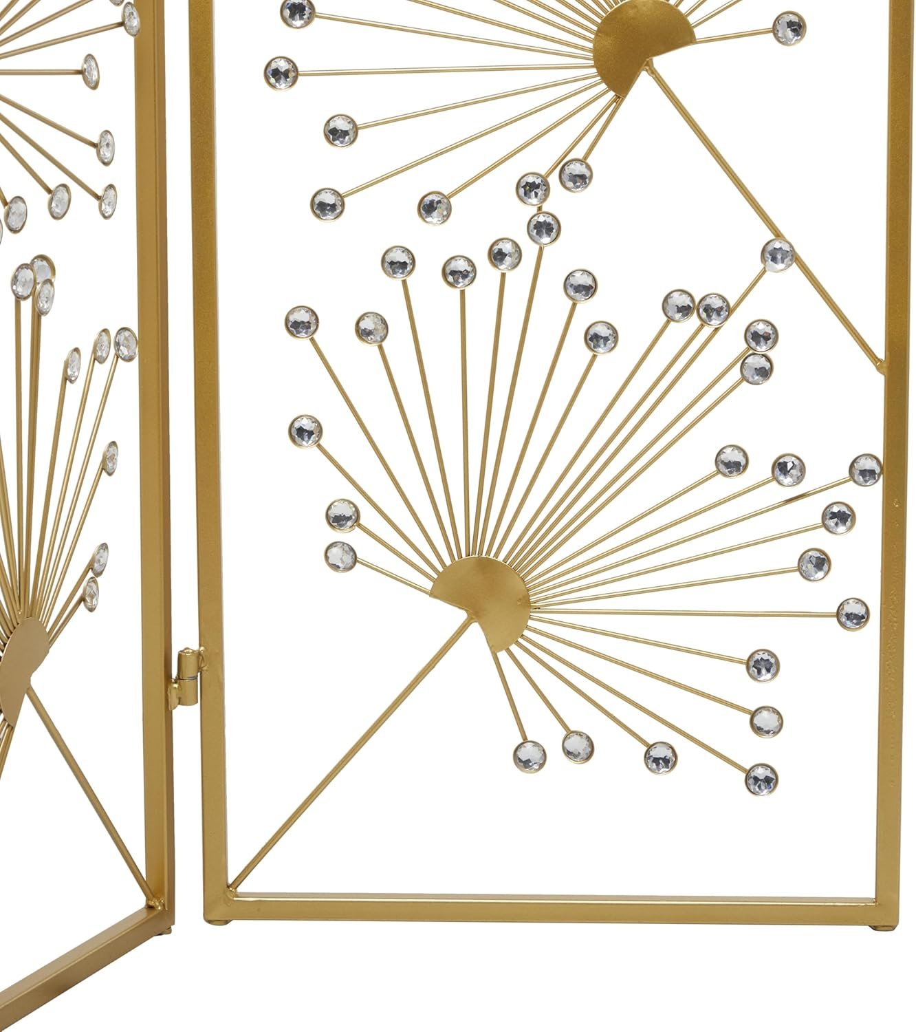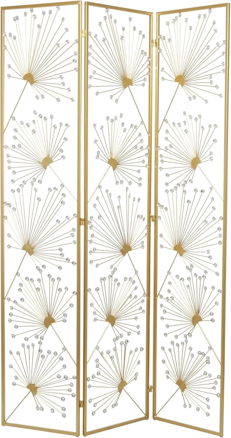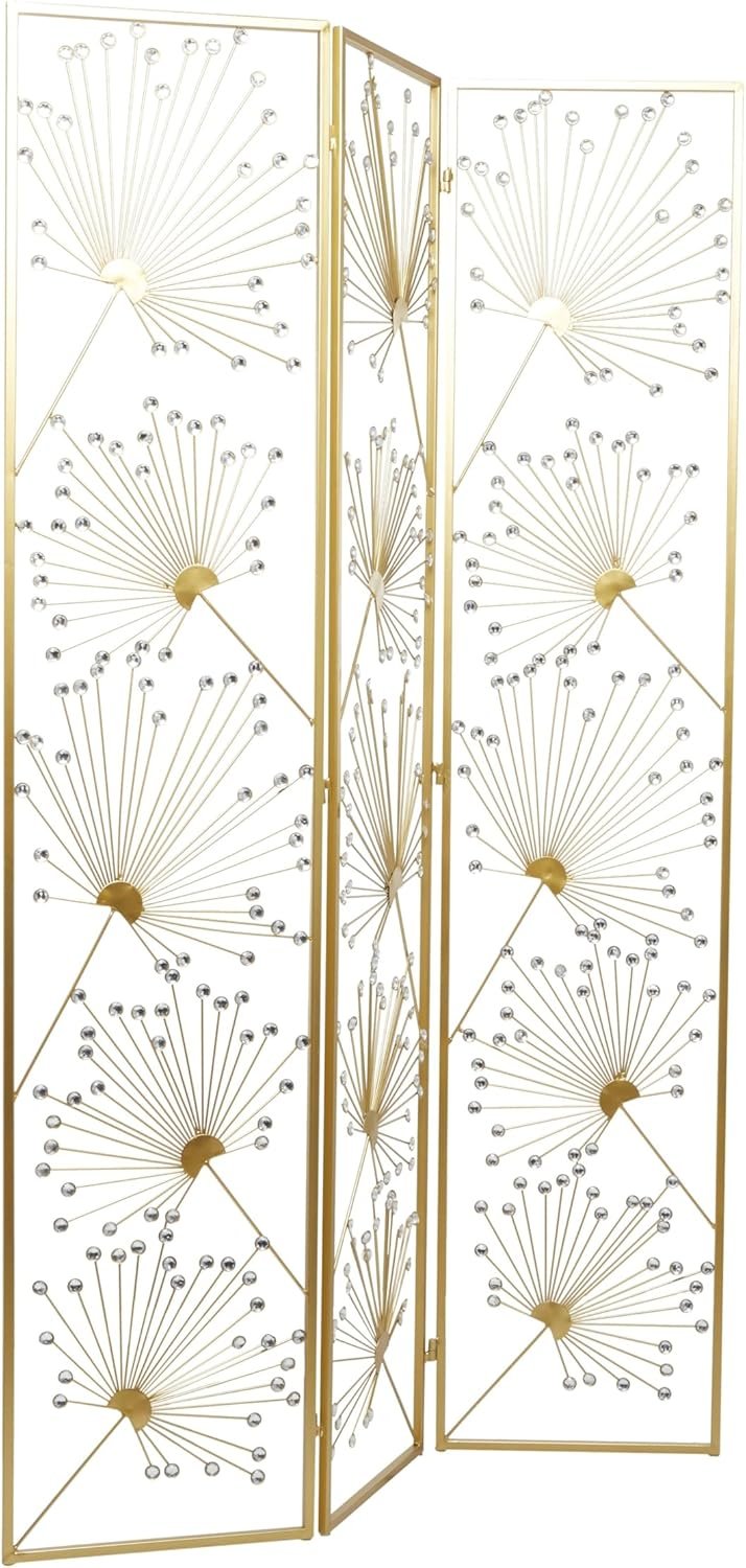 - El divisor de ambientes rectangular y la mampara de privacidad plegable presentan un acabado dorado satinado y están adornados con cuentas de acrílico transparente.