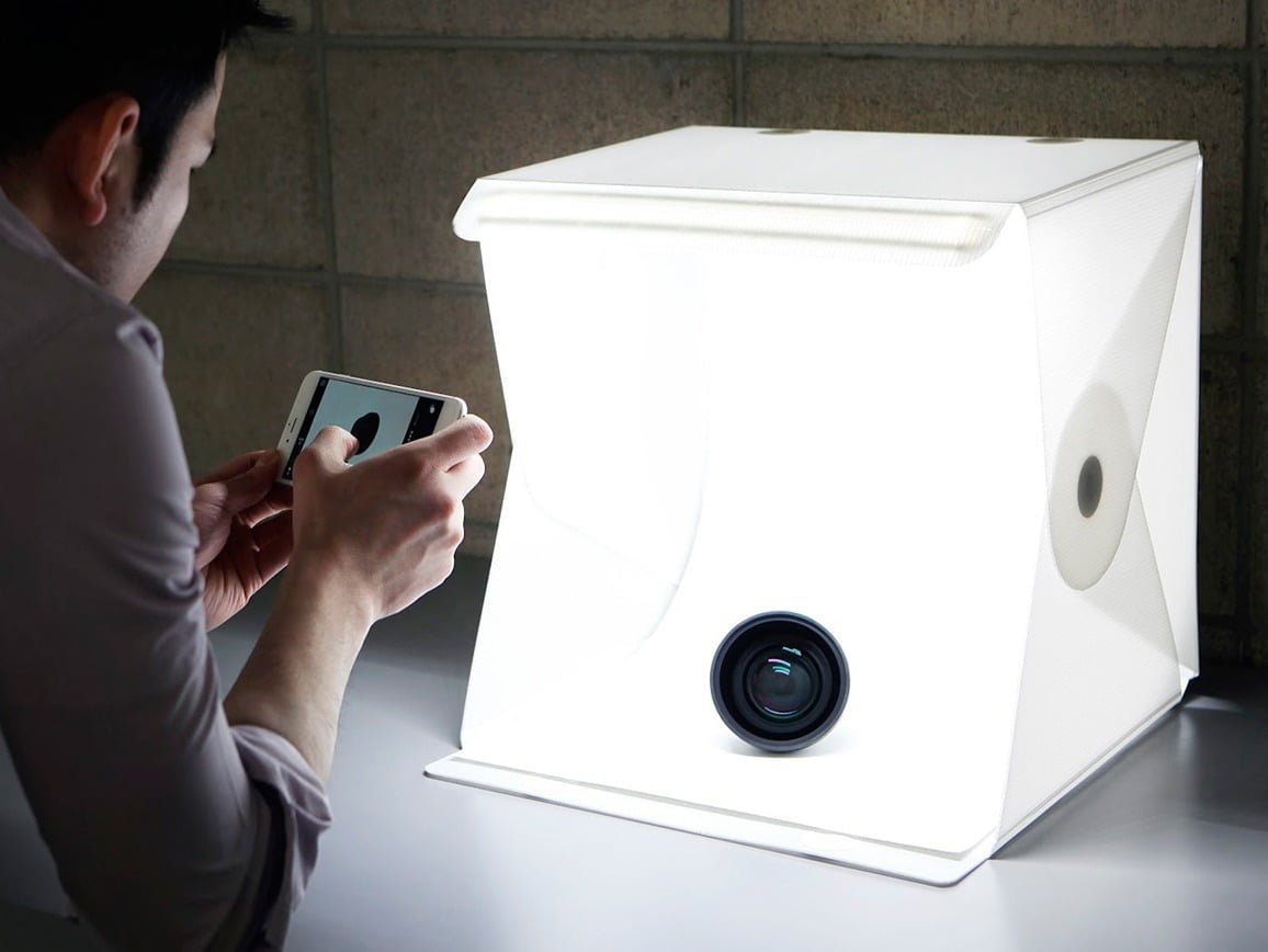– Es una caja blanca que contiene una tira led en la parte superior, diseñada para que puedas sacar las fotos sobre fondo blanco o negro sin necesidad de edición.