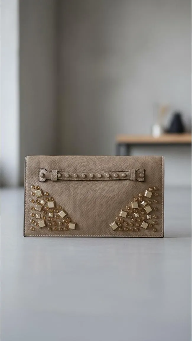 Cartera clutch color taupe (gris topo) de la marca Miscellaneous by CAFF, diseñada para mujeres con estilo que buscan elegancia con un toque moderno. Su diseño combina materiales de calidad con detalles metálicos dorados y aplicaciones en relieve que realzan cualquier outfit.