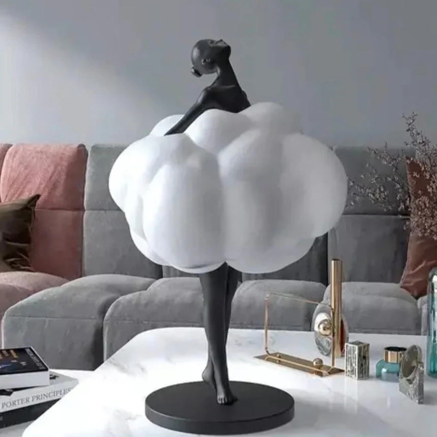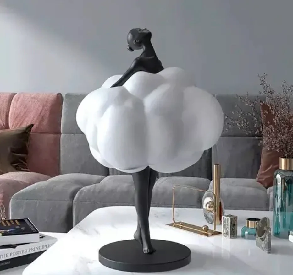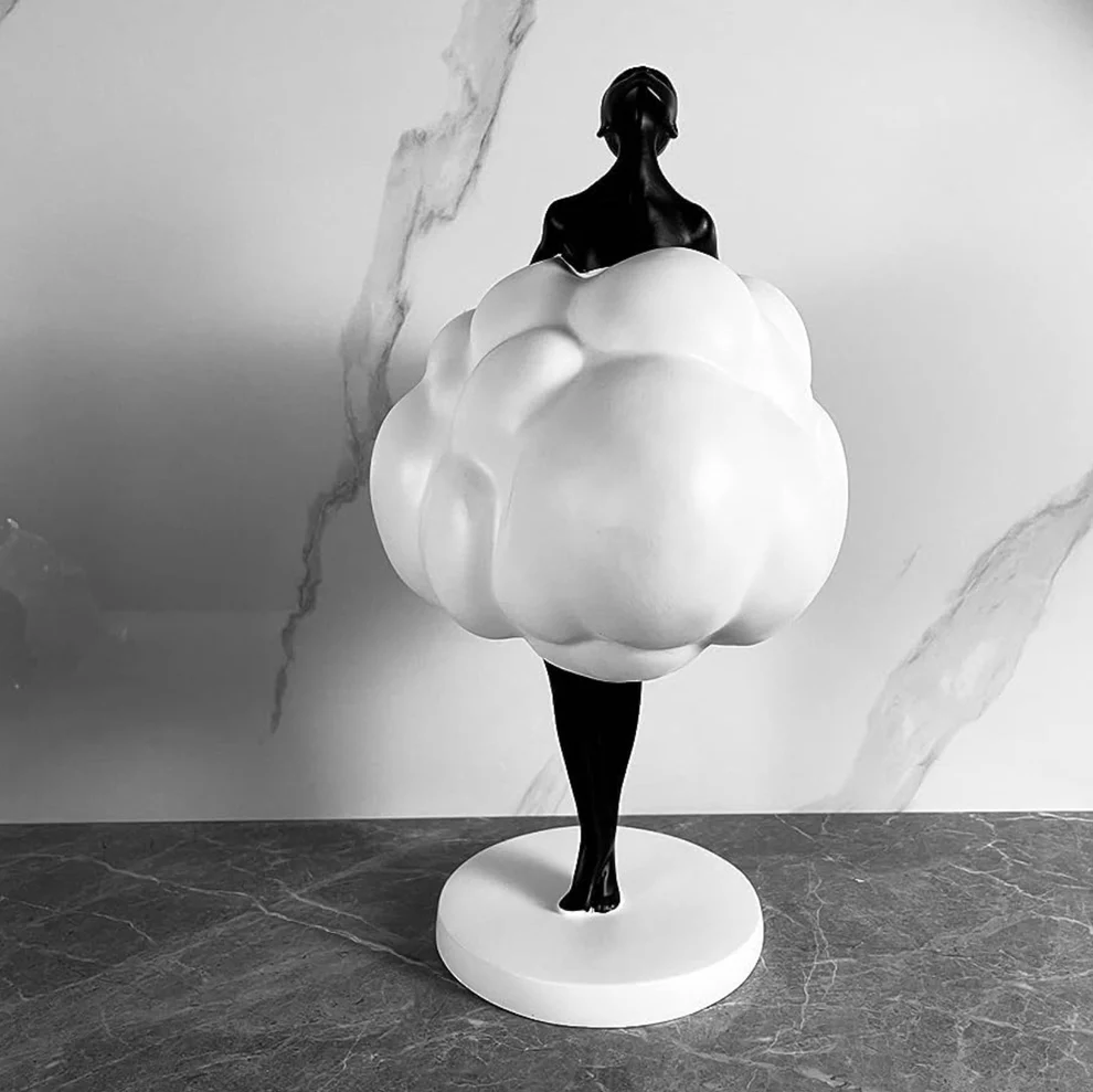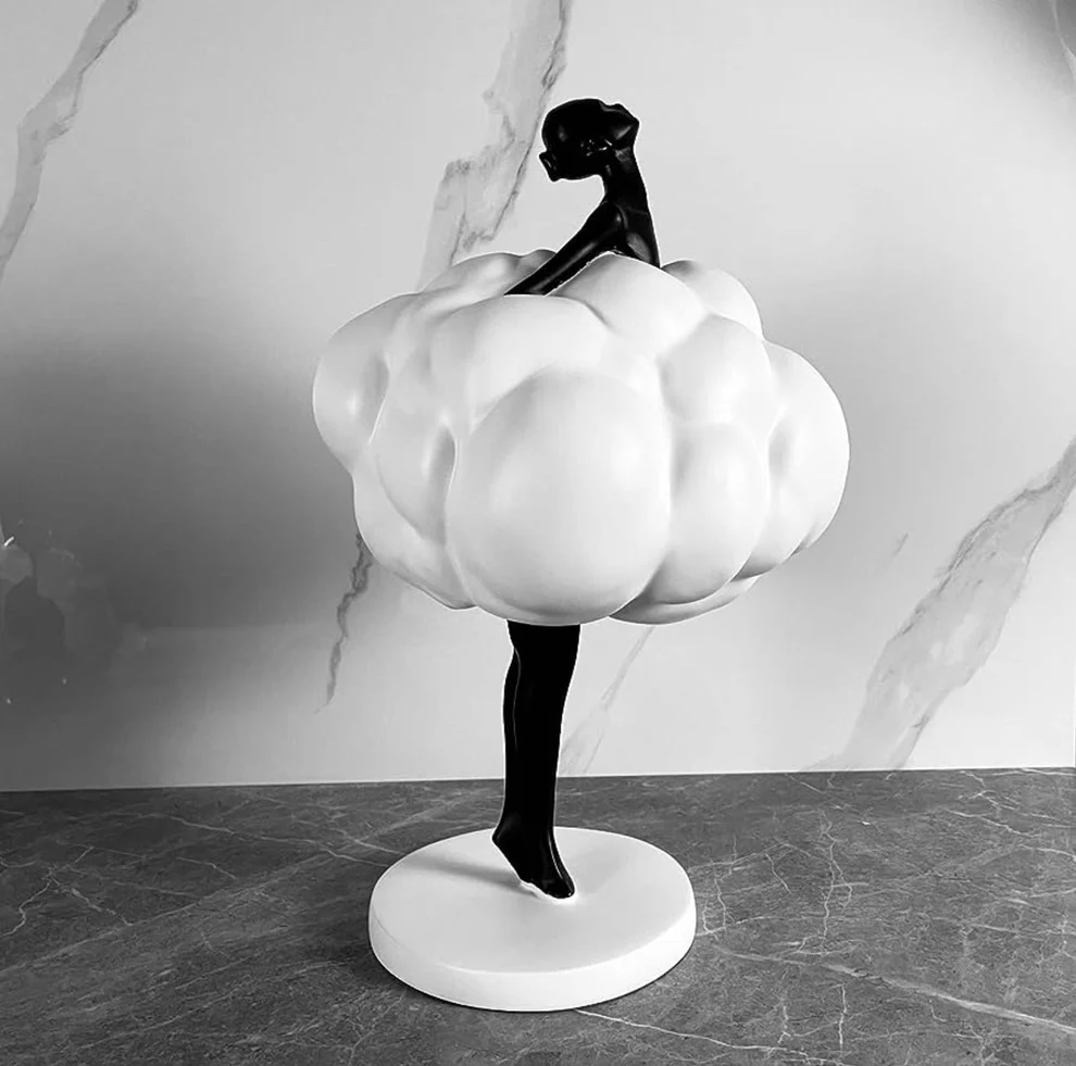 Esta escultura combina una figura femenina minimalista con una voluminosa nube blanca, creando un contraste visual impactante y lleno de poesía.