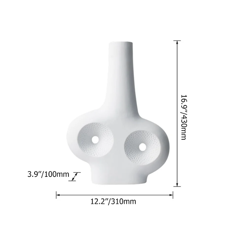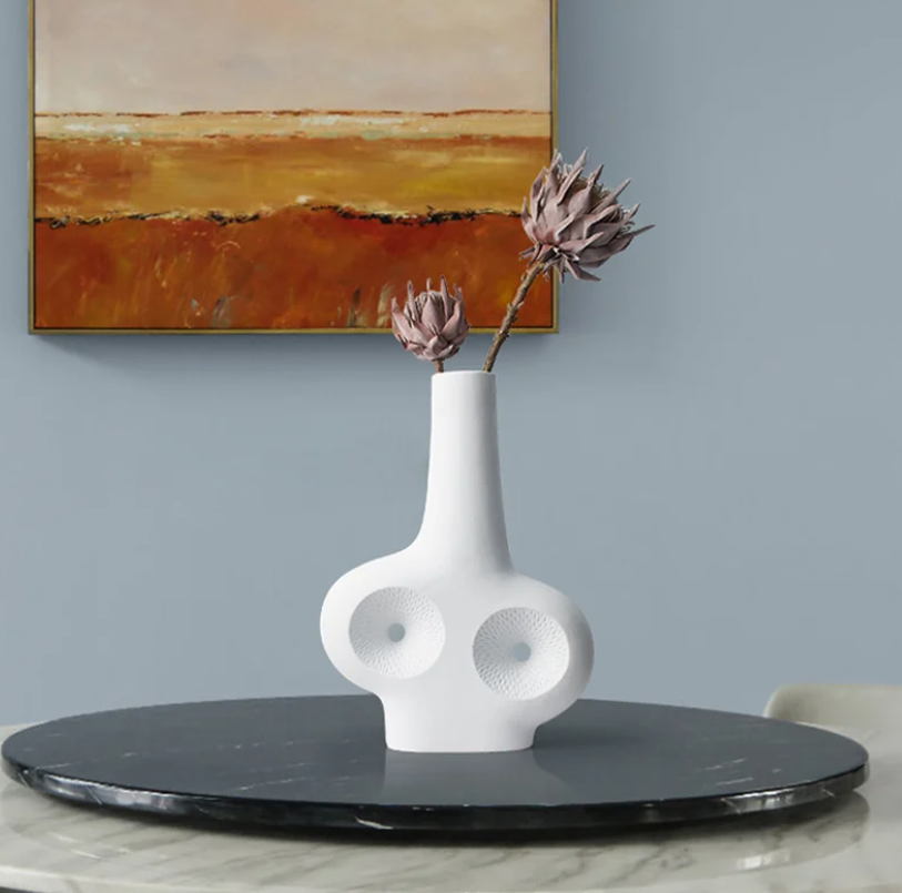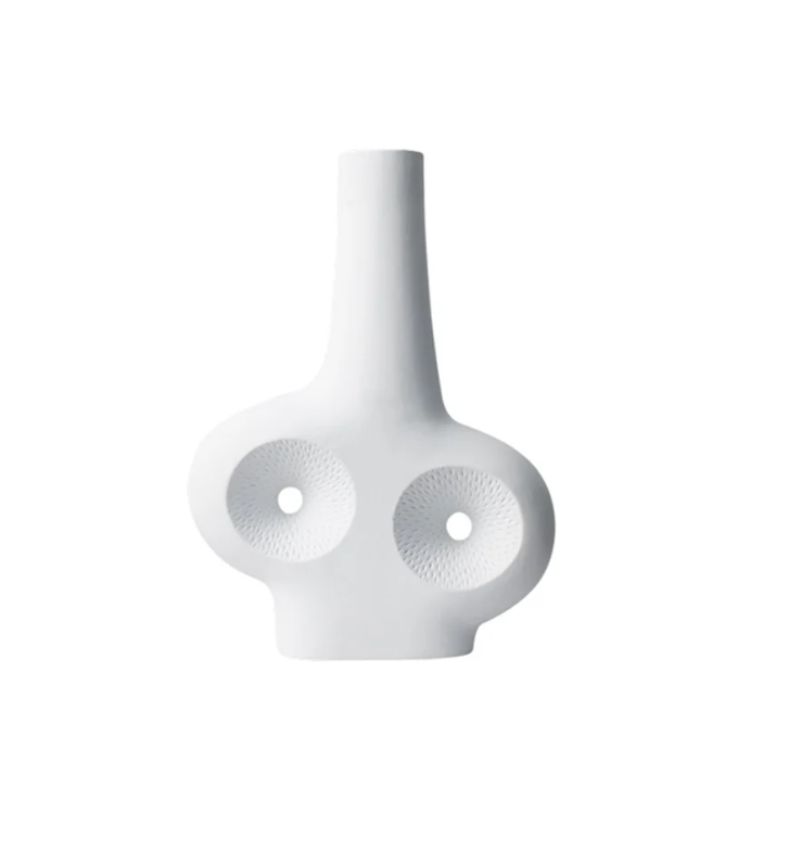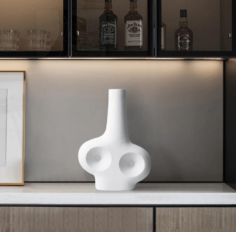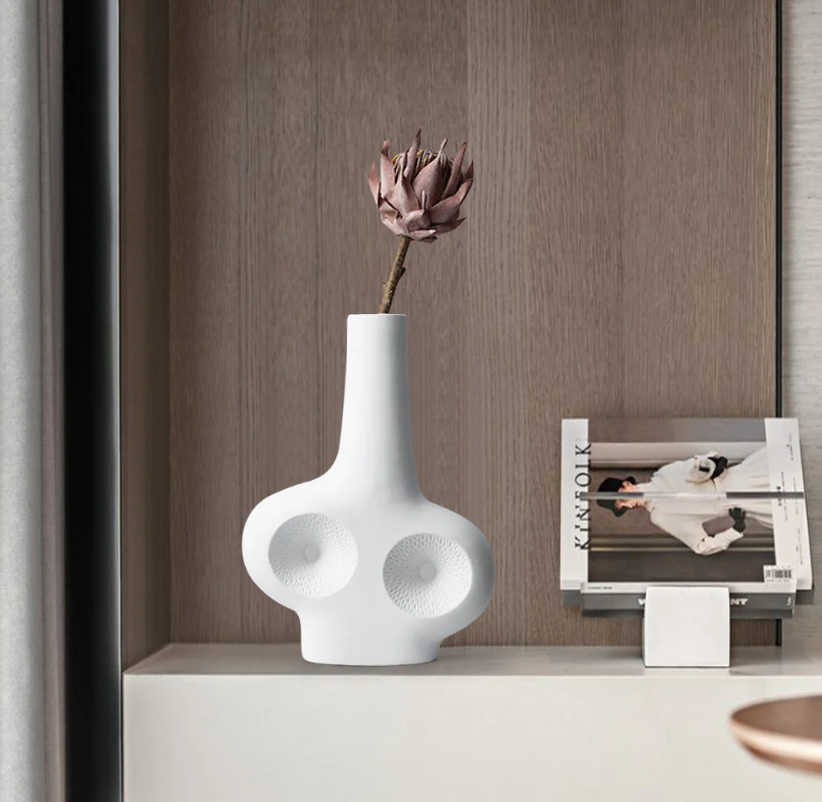 La superficie blanca mate resalta las formas suaves y permite que la luz dibuje sombras delicadas en sus relieves, aportando profundidad visual incluso cuando el florero se encuentra vacío.