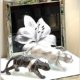 mármol con estructura de aluminio. Presenta un acabado de globo en oro metálico y blanco escarcha. Diseñado con eje de
