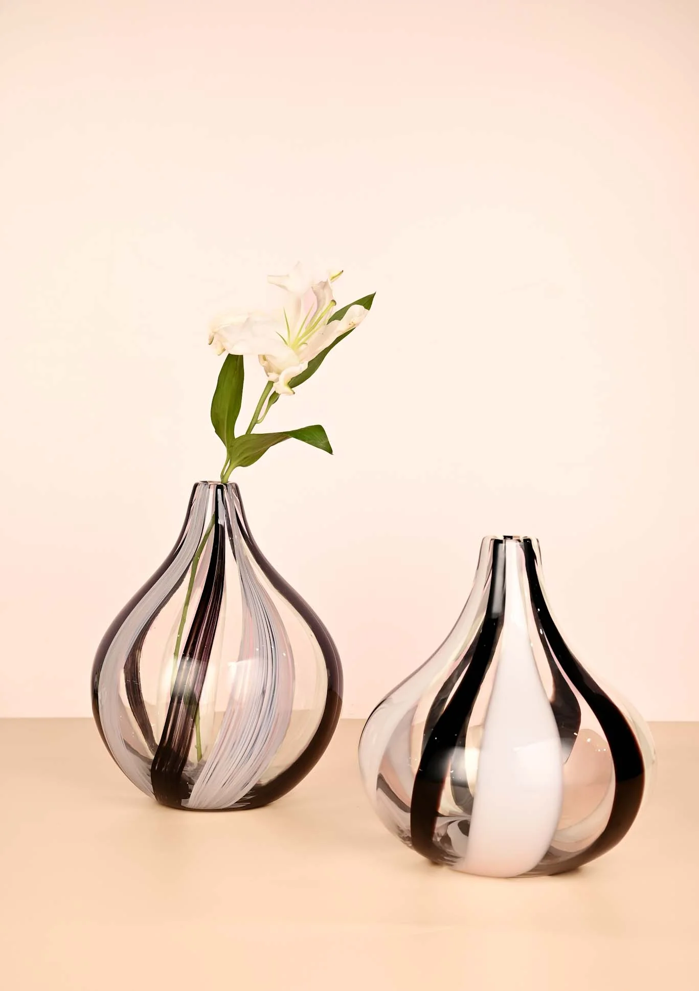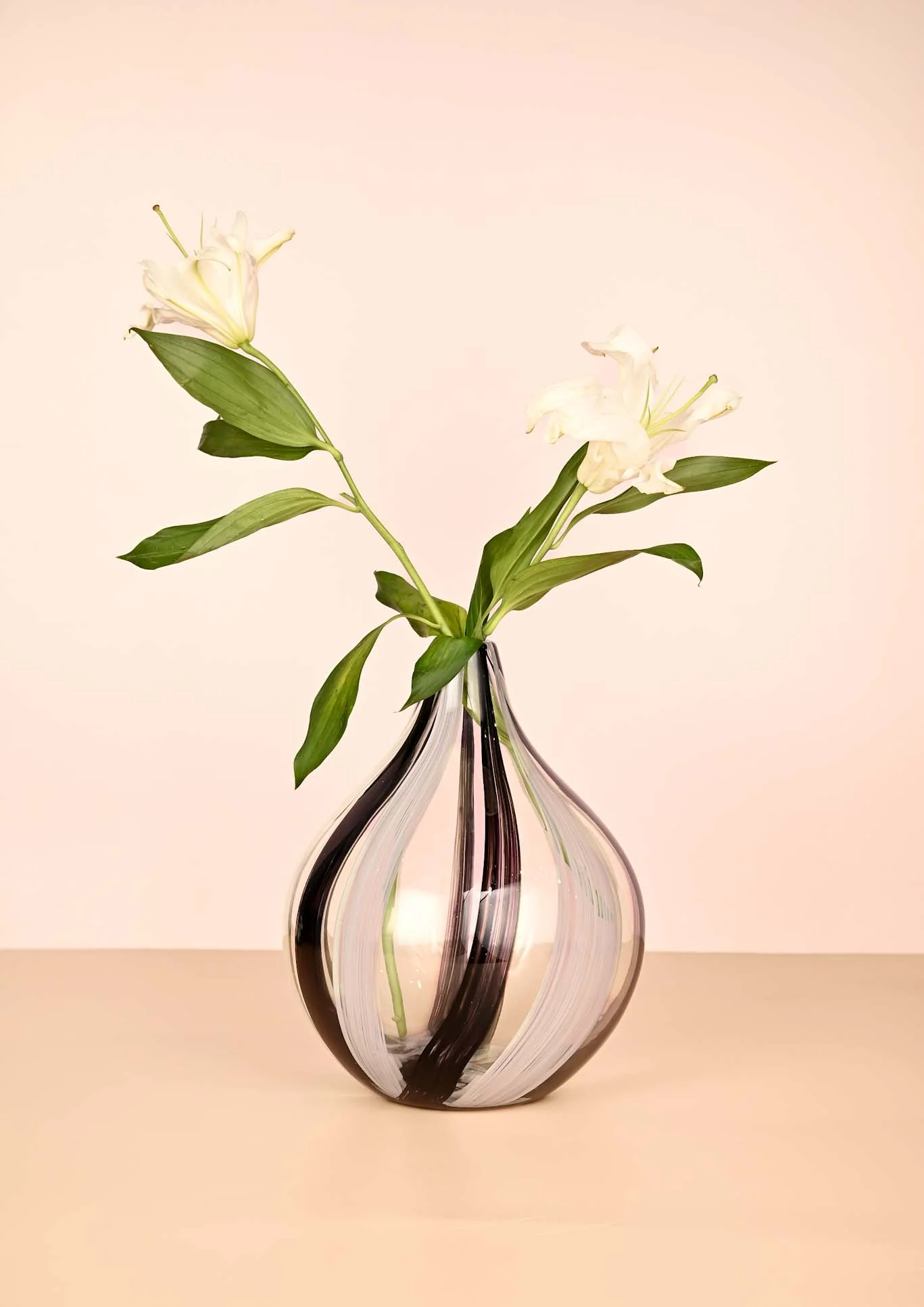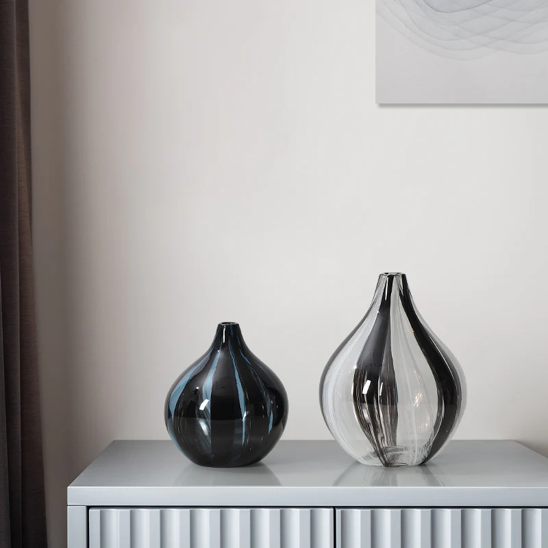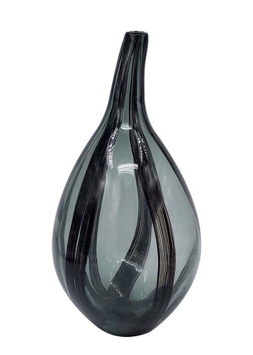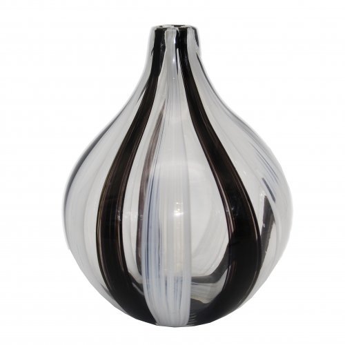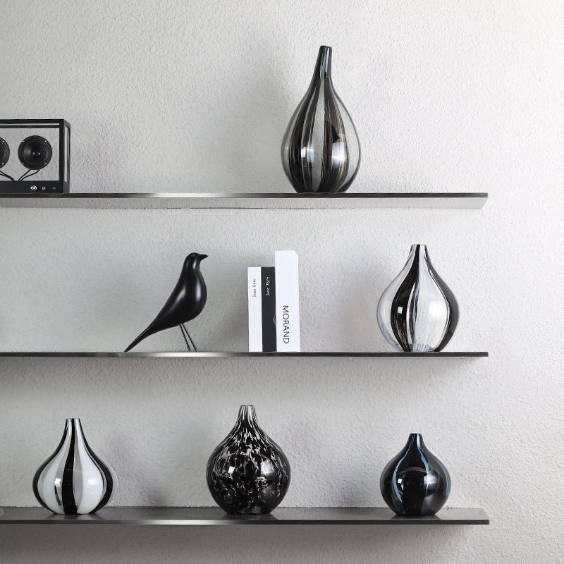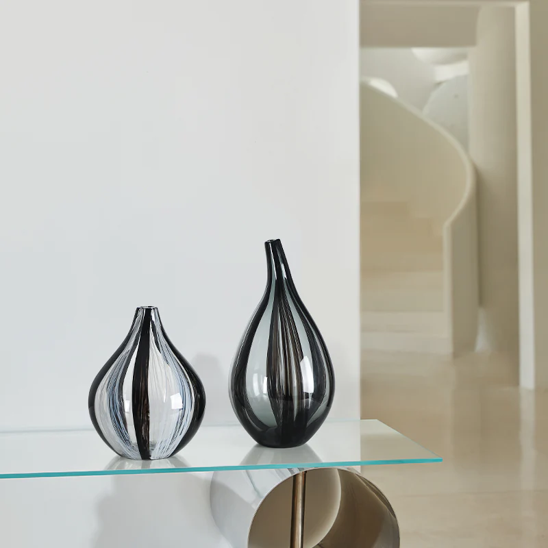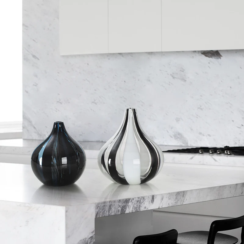 Este jarrón de cristal murano redondeado, con un alegre estampado de rayas blancas, grises y negras, es perfecto para quienes desean añadir un toque sutil de estilo y un atractivo visual a la decoración de su hogar. Su forma redondeada crea una sensación de suavidad y elegancia. La pequeña abertura del jarrón es ideal para colocar un solo tallo o un pequeño ramo de flores. El cristal permite que la belleza de las flores resplandezca, mientras que las rayas blancas, grises y negras añaden un toque de fantasía y jovialidad al diseño. Es una pieza impresionante para el salón, el dormitorio o la oficina.