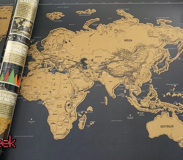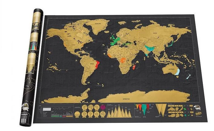 Este mapa mundial tipo “scratch” invita a raspar cada destino visitado para revelar colores vibrantes debajo. Cada viaje se convierte en marca visible, en memoria tangible.
