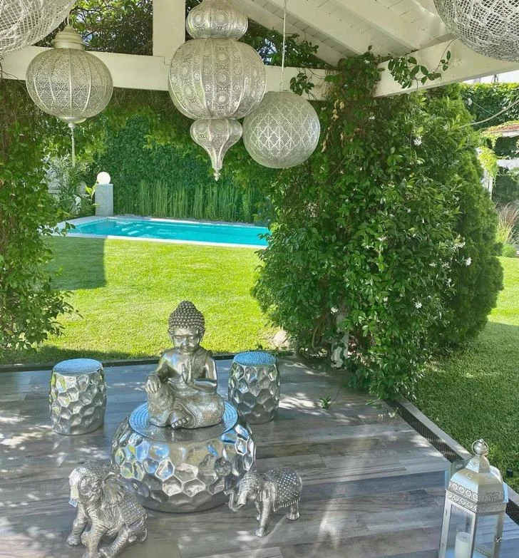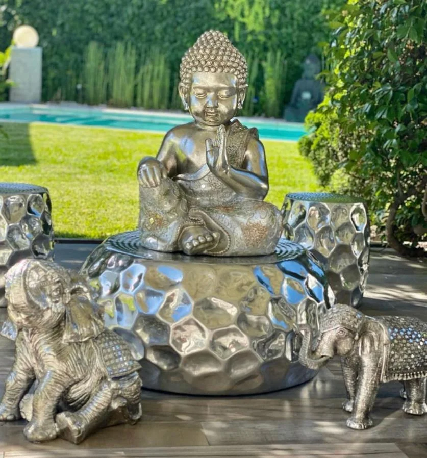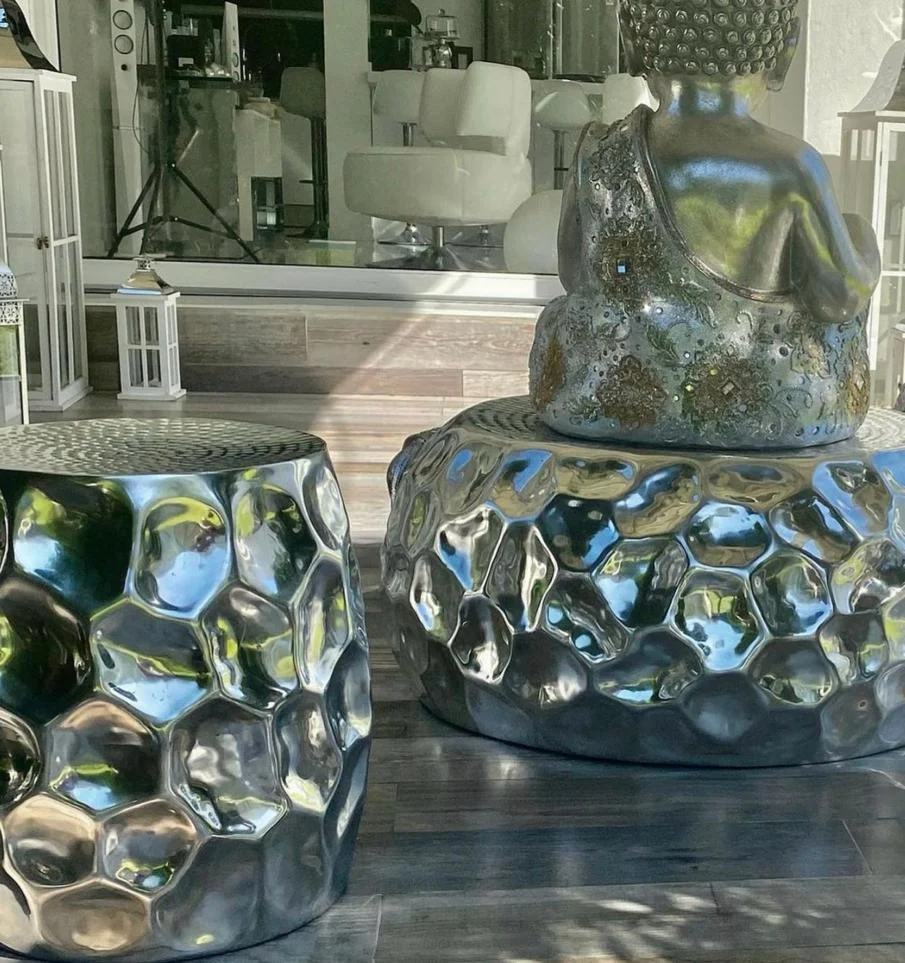 Su superficie martillada refleja la luz de manera orgánica, creando un juego sutil de brillos que cambia a lo largo del día.