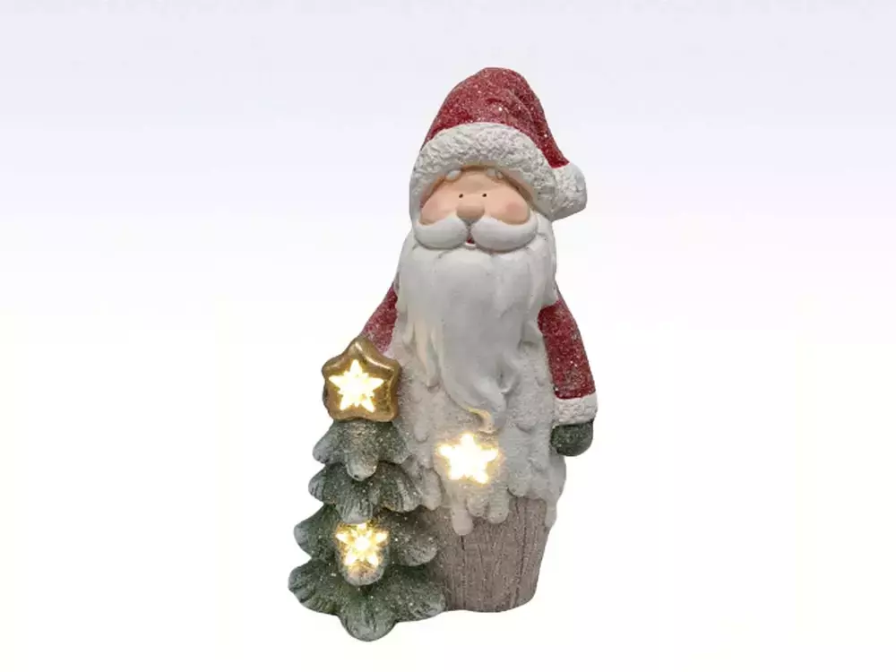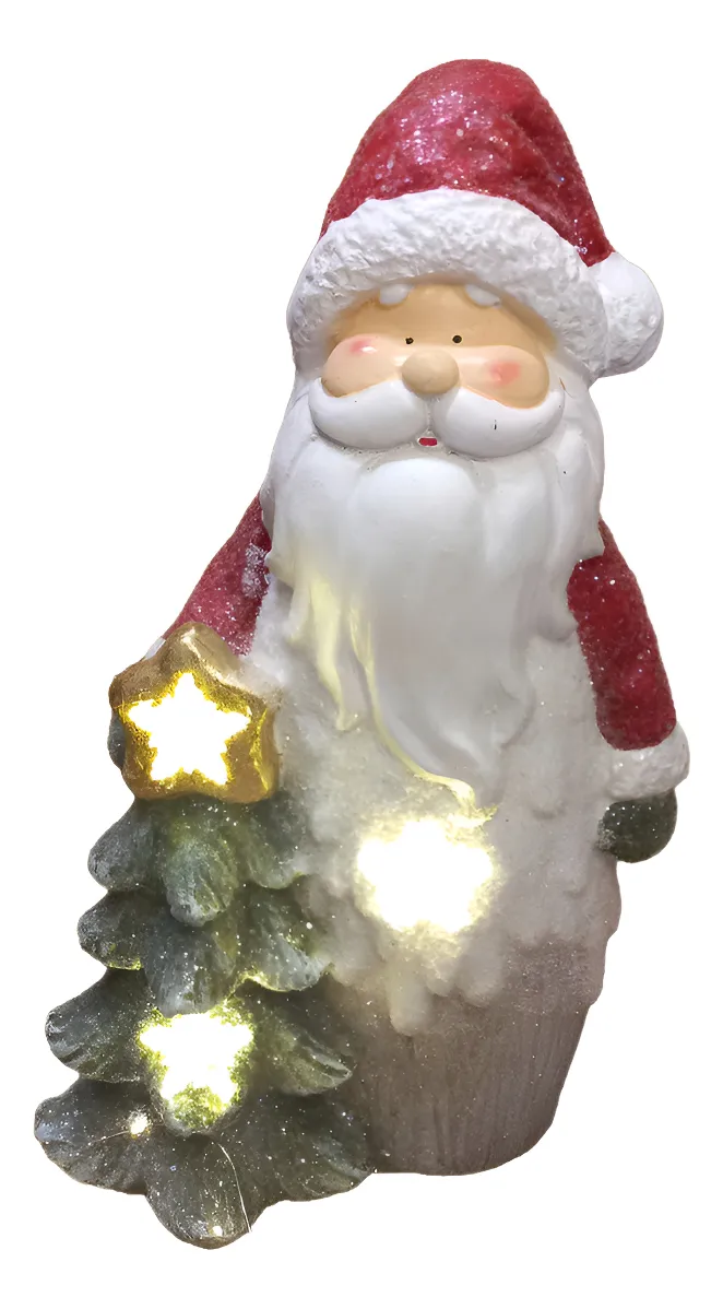 - Es una figura decorativa que presenta a Papá Noel junto a un árbol de Navidad escarchado.