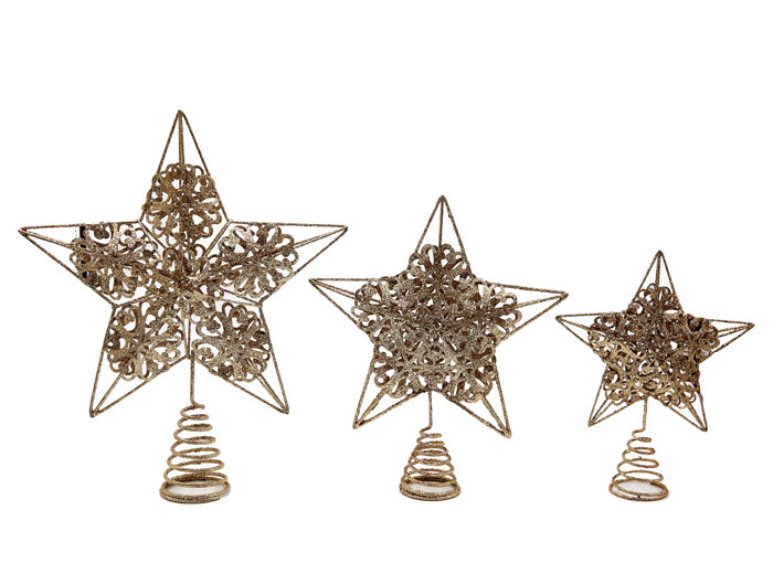 Puntales exclusivos para árboles de Navidad en varias medidas con brillos deslumbrantes. Añade un toque de elegancia y resplandor a tu árbol con estos puntales únicos, diseñados para destacar y complementar tu decoración navideña. Crea un ambiente festivo y sofisticado en tu hogar.