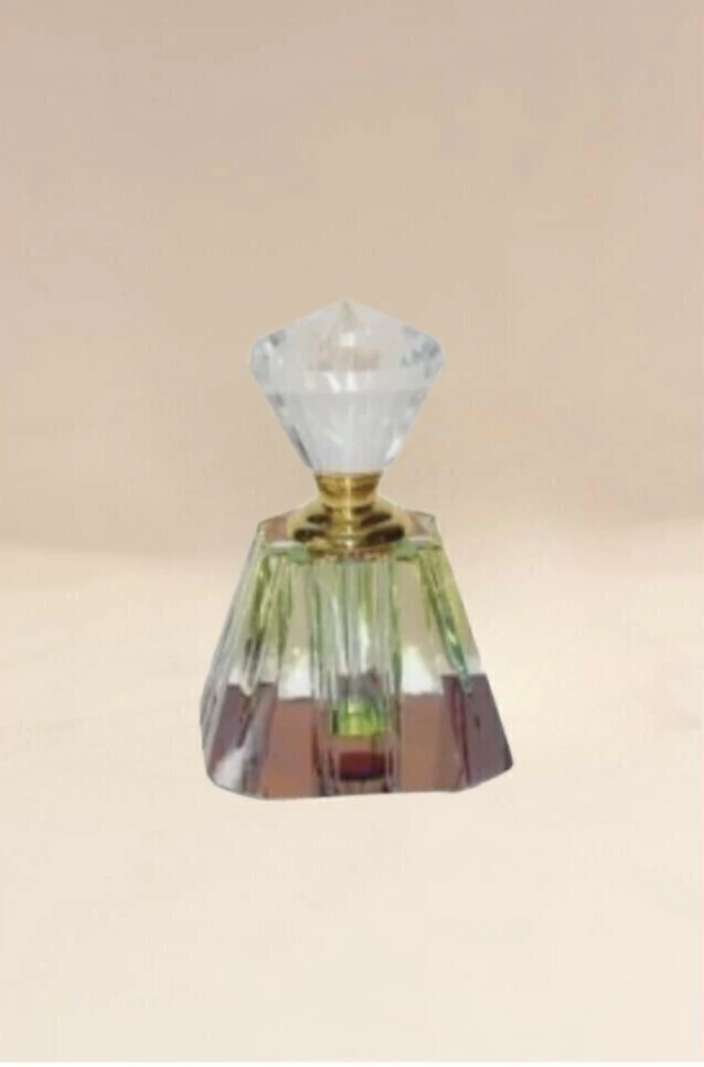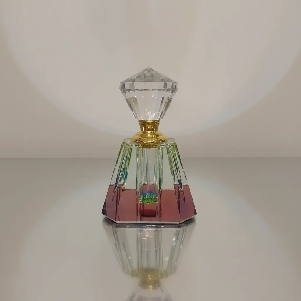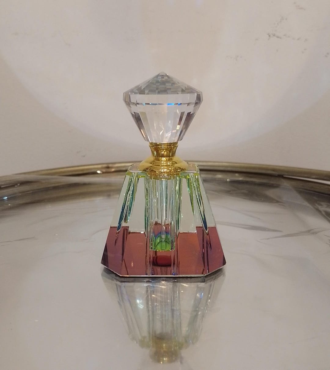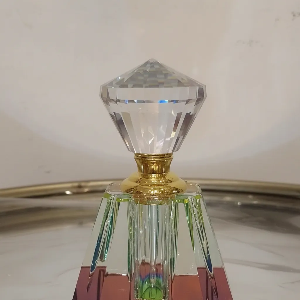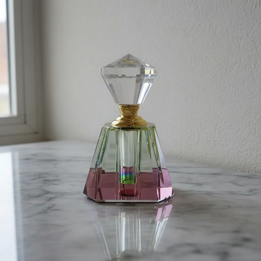 - El cuerpo del frasco es de cristal transparente con tonos iridiscentes o de colores, y la parte superior es un tapón de cristal con forma de diamante y una base dorada.