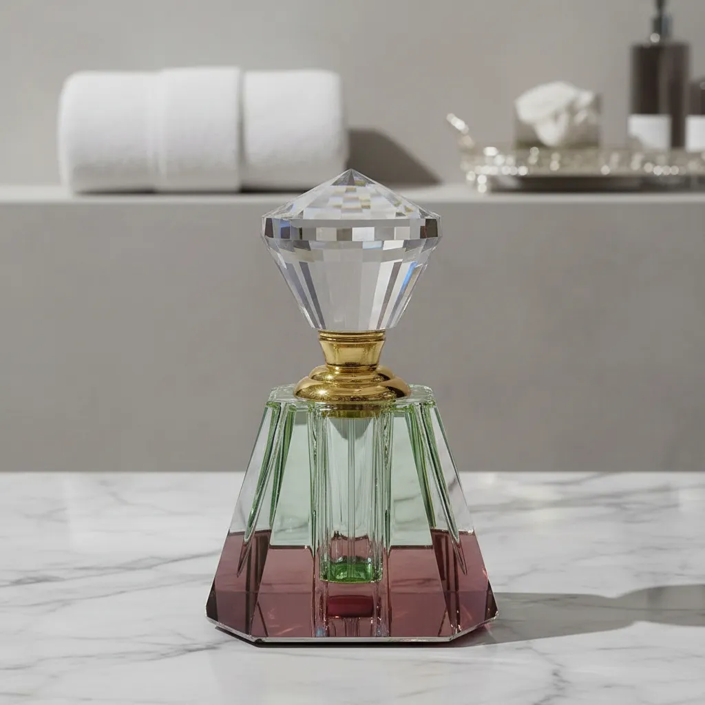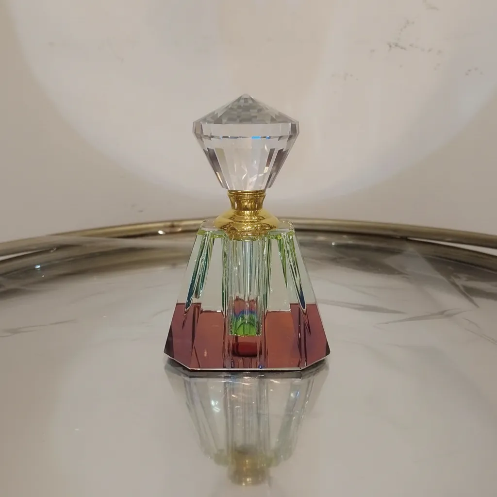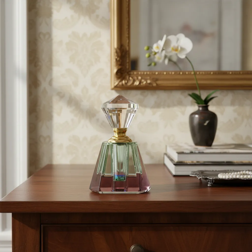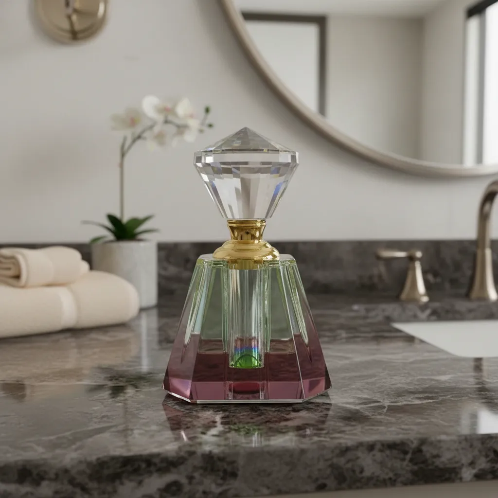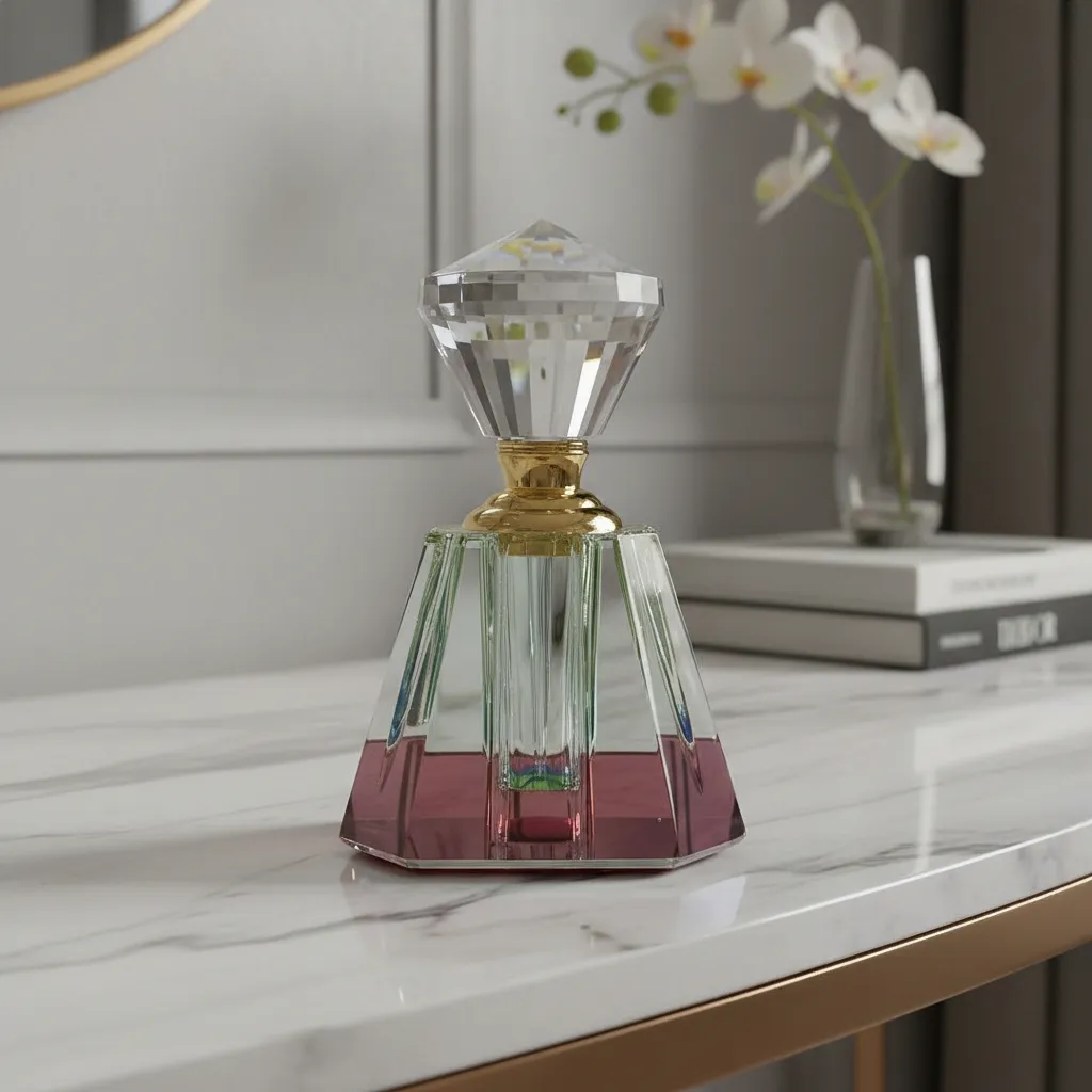 - El cuerpo del frasco es de cristal transparente con tonos iridiscentes o de colores, y la parte superior es un tapón de cristal con forma de diamante y una base dorada.