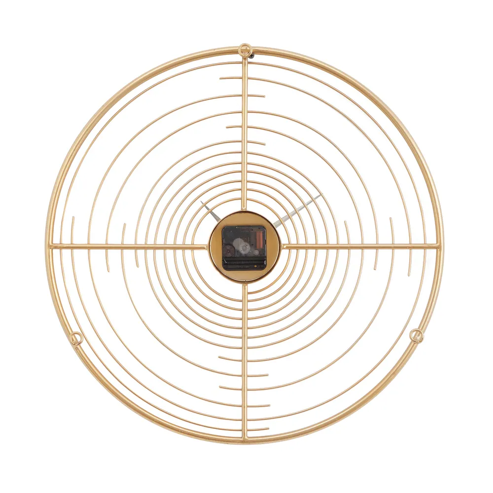 Añade una deslumbrante pieza de reloj de pared a tus encantadores espacios de vida con este reloj de metal redondo de estilo abierto que muestra un cautivador diseño de efecto ondulado de agua en un acabado de hierro dorado suavemente pulido