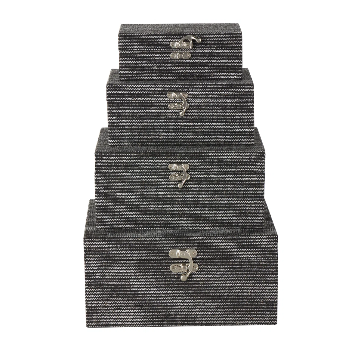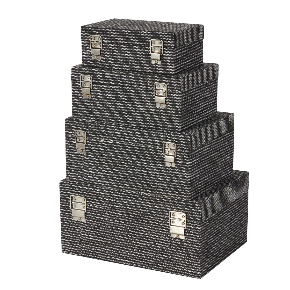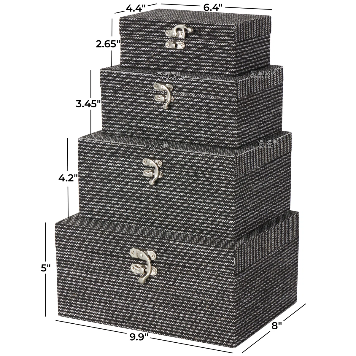 - Este juego de 4 cajas decorativas de tela para guardar recuerdos incluye cierres plateados para mayor seguridad.