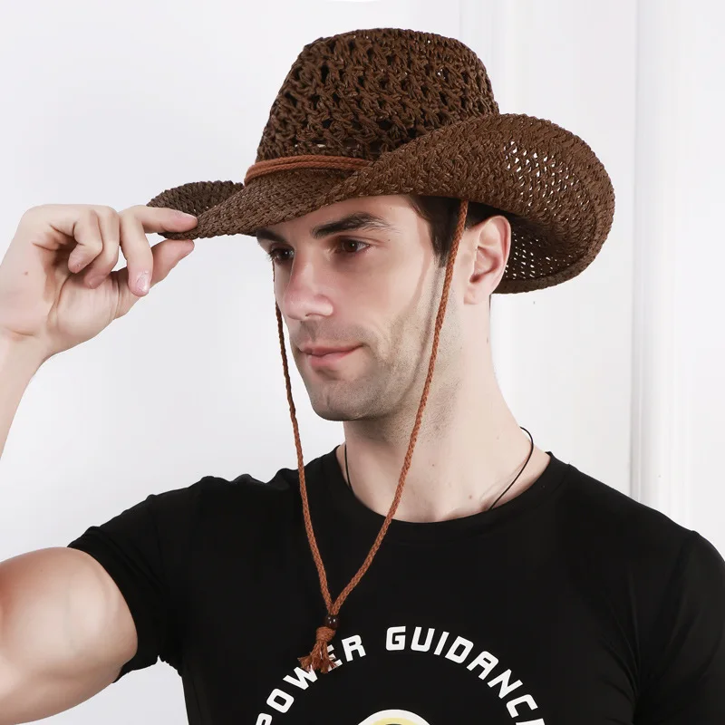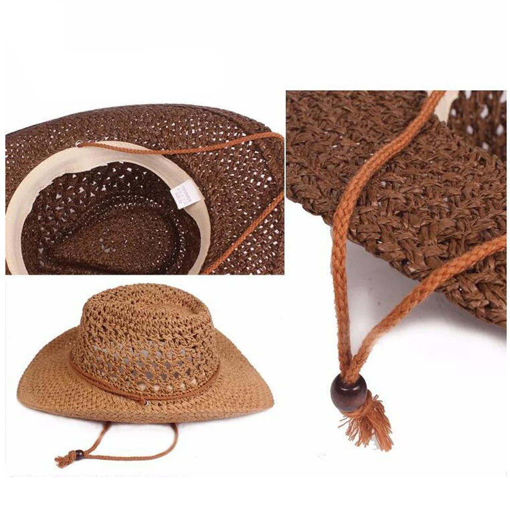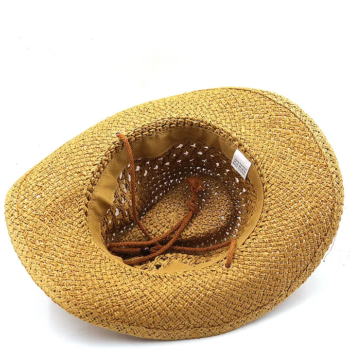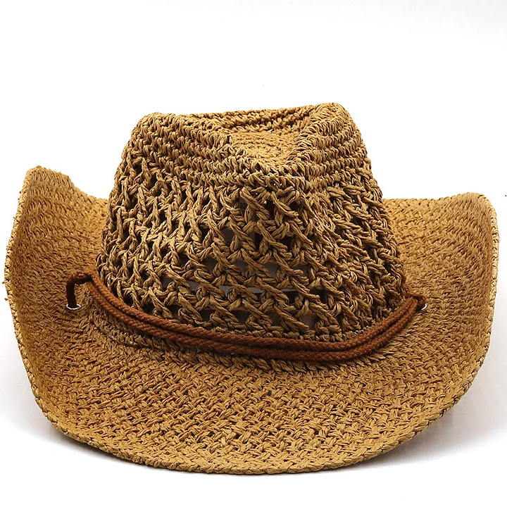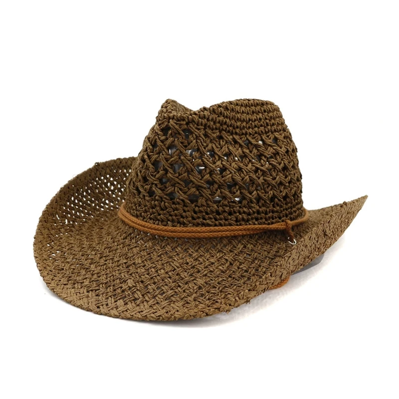 Sombrero vaquero occidental con diseño hueco con cuerda de tejido de paja ajustable.