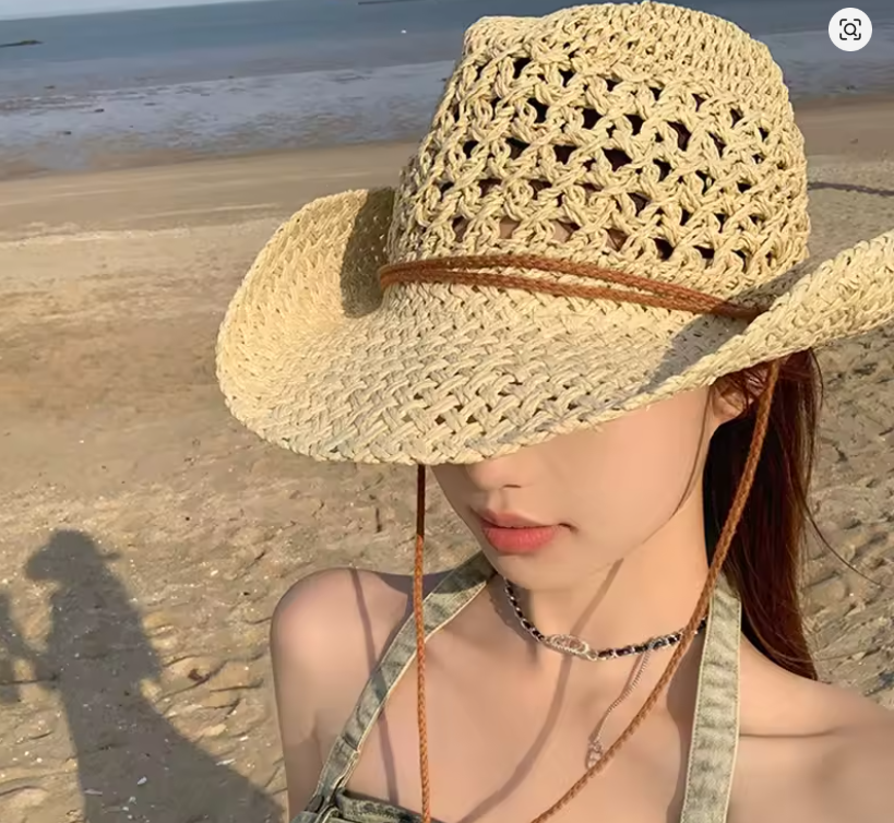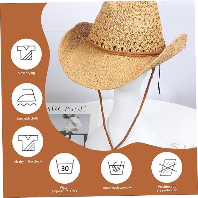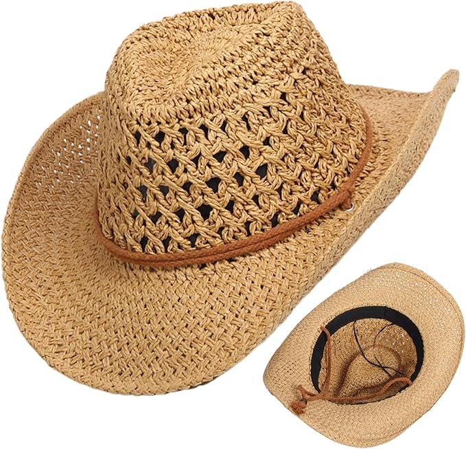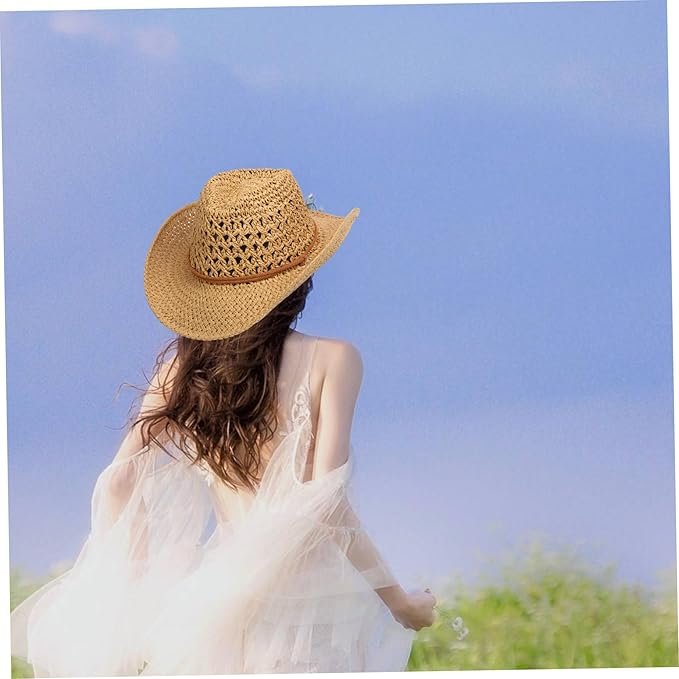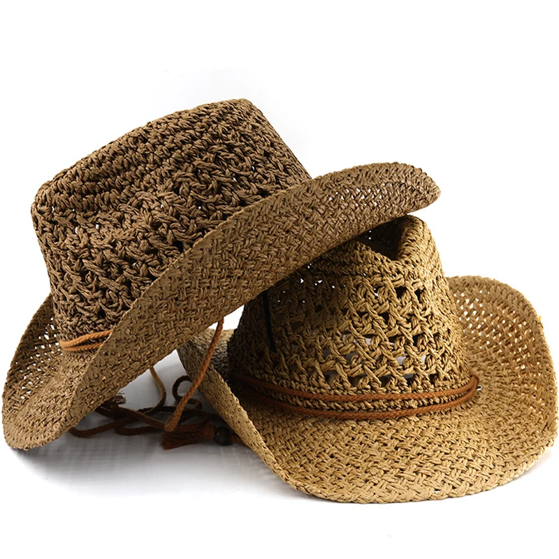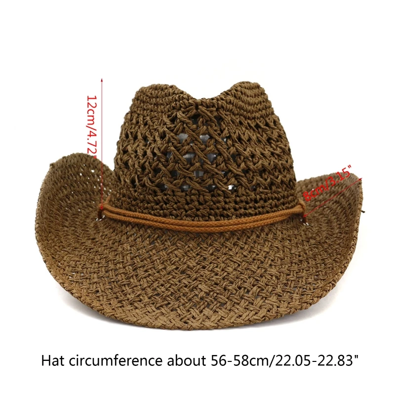 Sombrero vaquero occidental con diseño hueco con cuerda de tejido de paja ajustable.