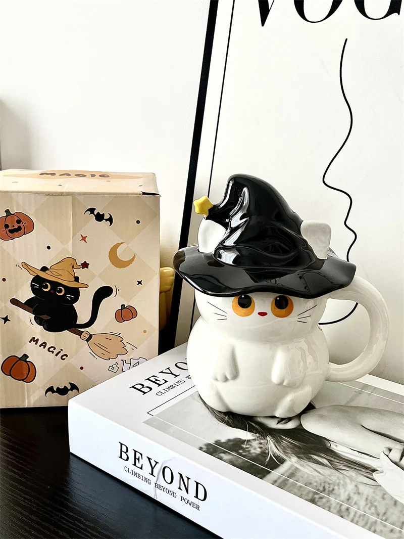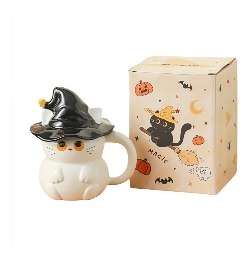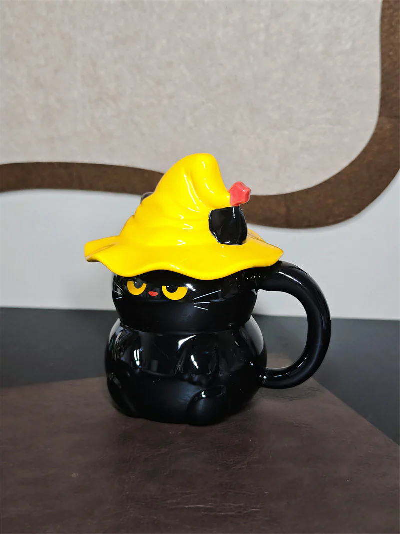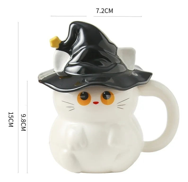 Adorable diseño de gatita bruja: Esta taza tiene la forma de una linda gatita blanca con grandes ojos amarillos y un sombrero de bruja negro adornado con un pequeño detalle amarillo. Su diseño divertido es perfecto para Halloween o para cualquier época del año, ideal para amantes de los gatos y la decoración festiva.