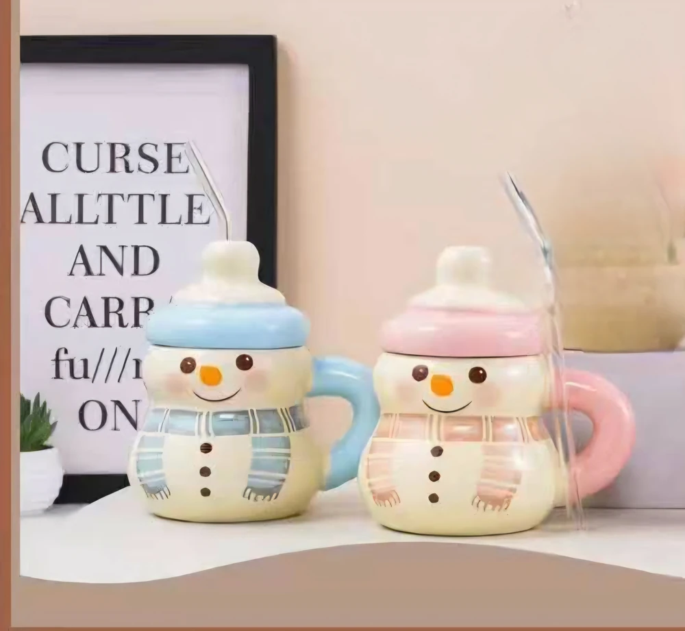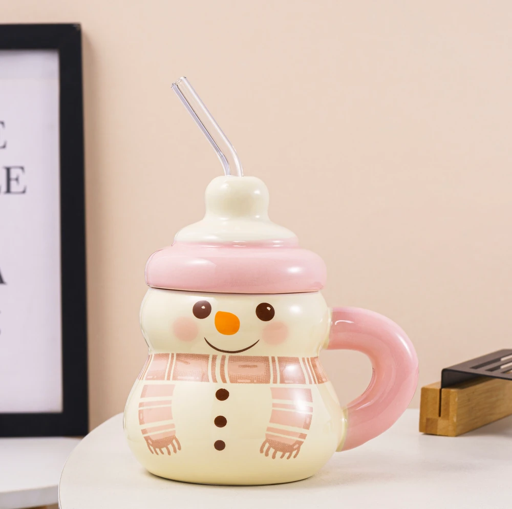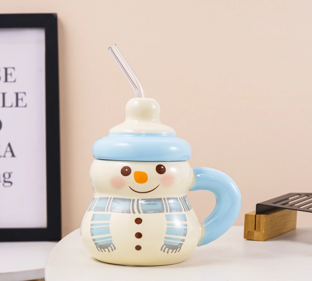 Taza de cerámica navideña Limited con tapa y sorbete 400 ml Muñeco de nieve verde